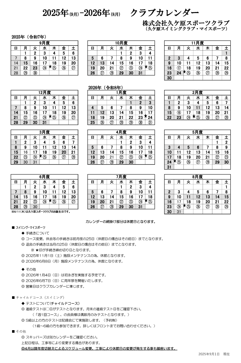 2025年2026年 レッスンカレンダー